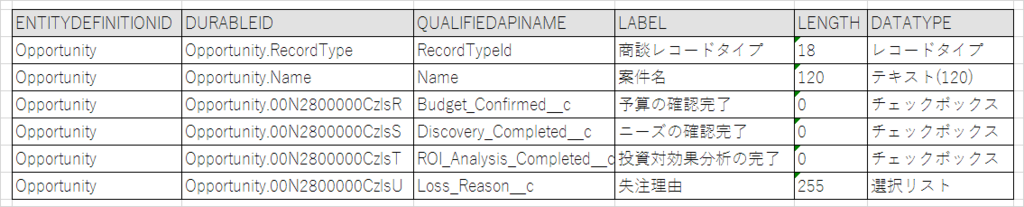 取得結果の"DurableId"のピリオド以降が項目IDです。
